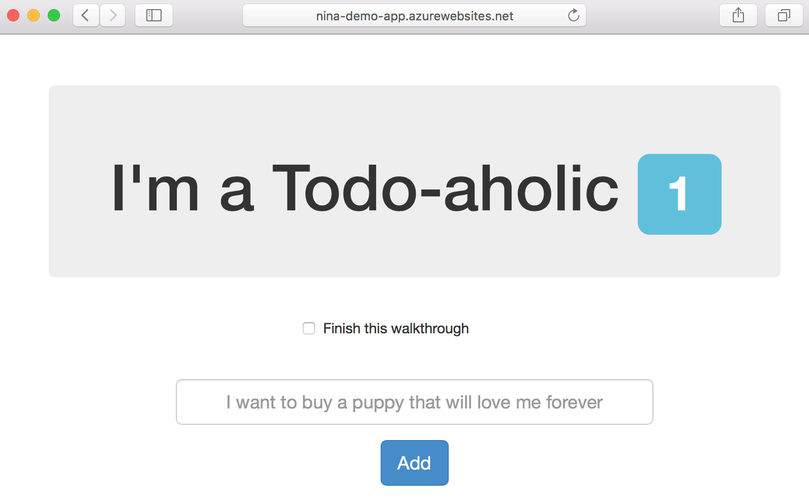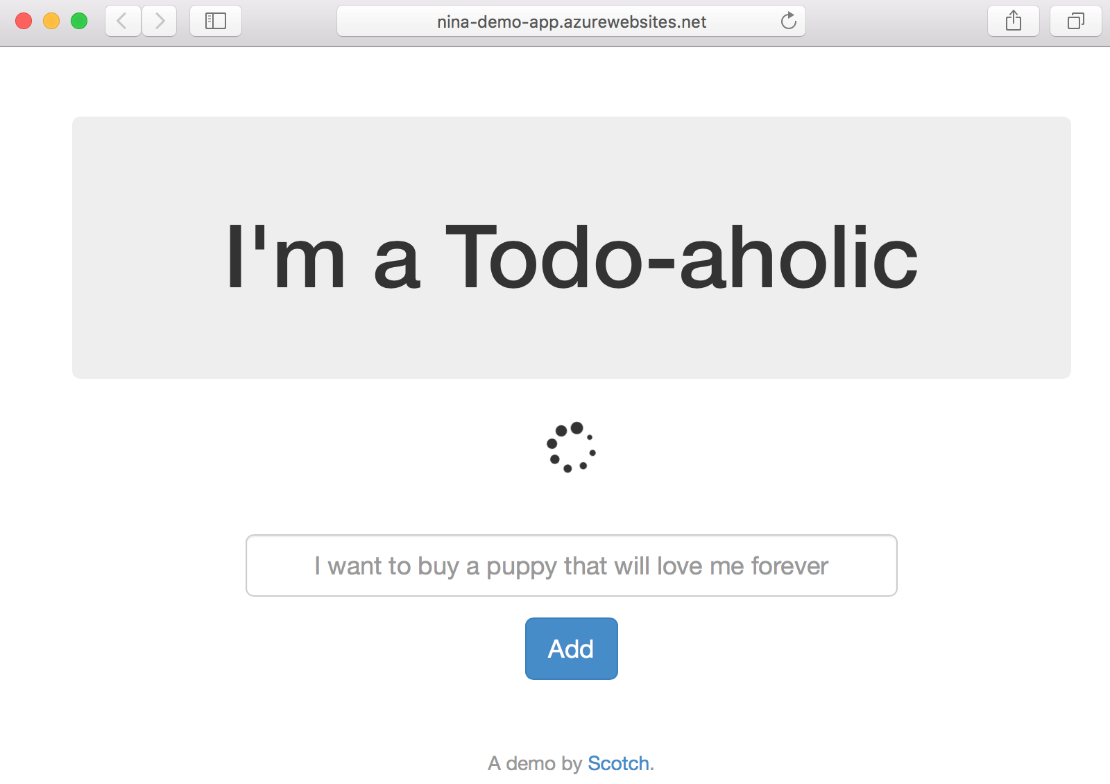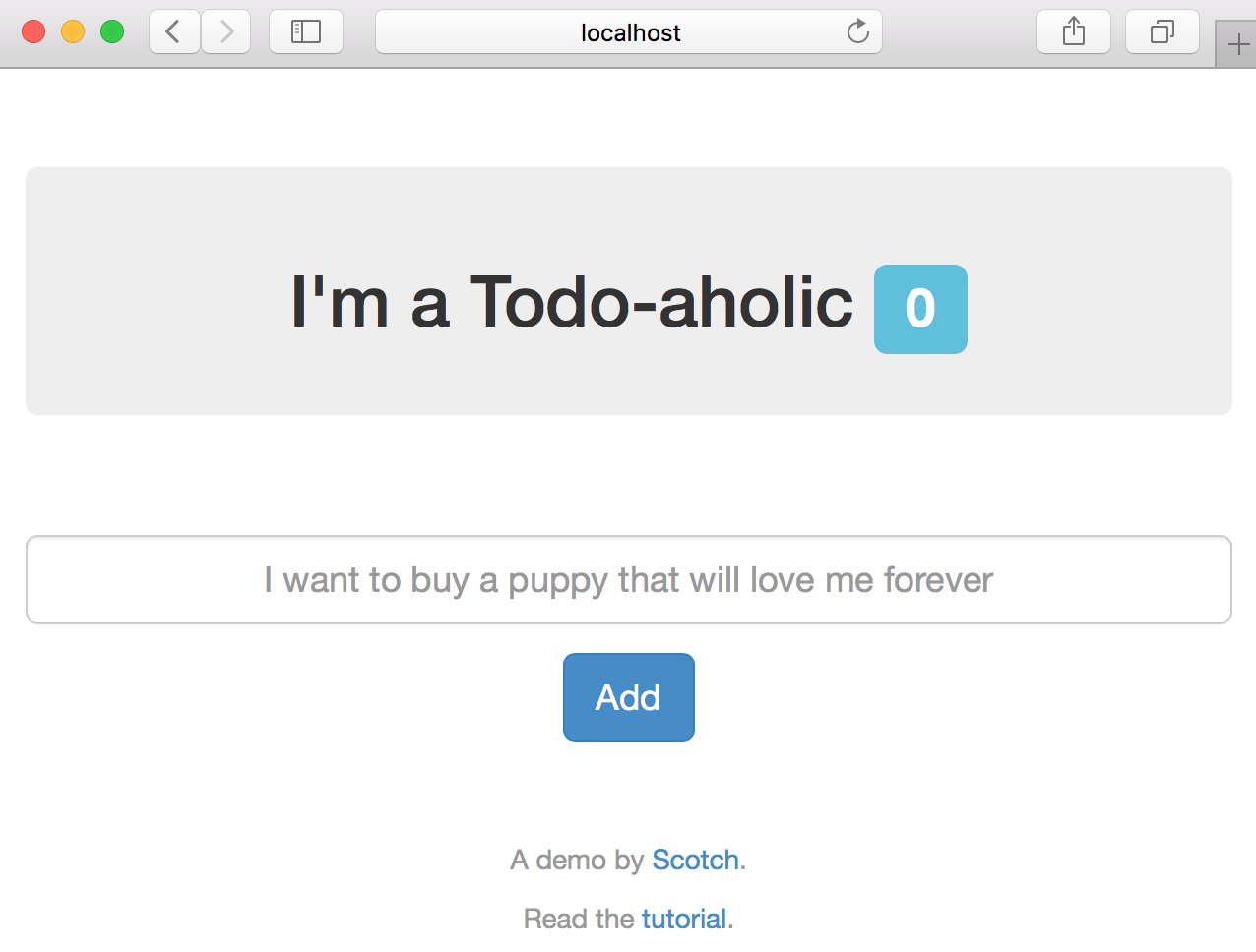 If you open a browser, you can navigate to http://localhost:8080 and see the running app. Type a message into the textbox and add/remove a few todos to get a feel for how the app works.
