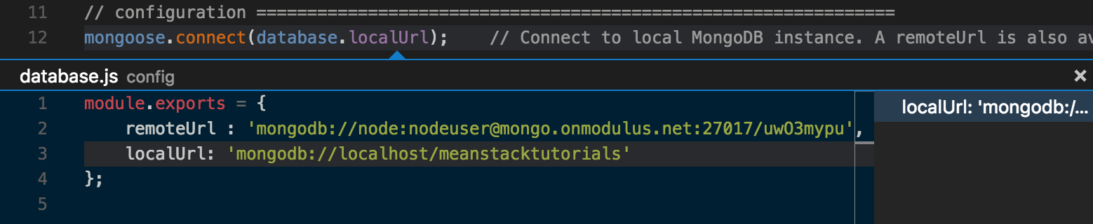 database.localUrlon line 12, and selectPeek Definition, which lets us quickly see how the app is configured to connect to MongoDB by default.