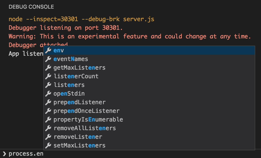 Additionally, this console is actually attached to our newly running app, so you can type JavaScript expressions, which will be evaluated in the app, and also includes auto-completion! For example, try typing process.env in the console to see what I mean.