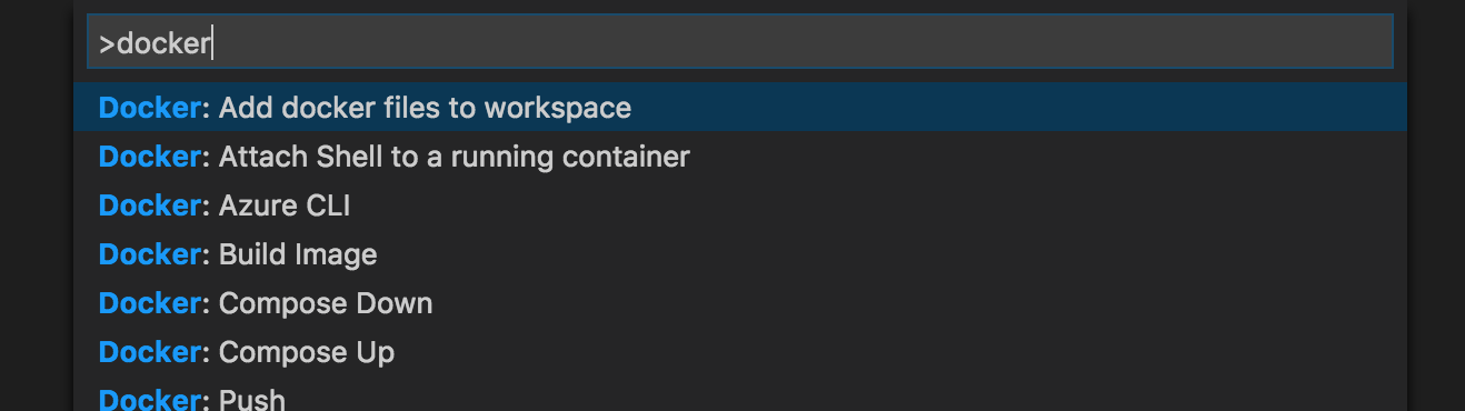 This extension includes many things, one of which is a simple command for generating a Dockerfile and docker-compose.yml file for an existing project. To see this in action, type F1 (to bring up the command palette) and type docker to display all of the commands that the Docker extension provides: