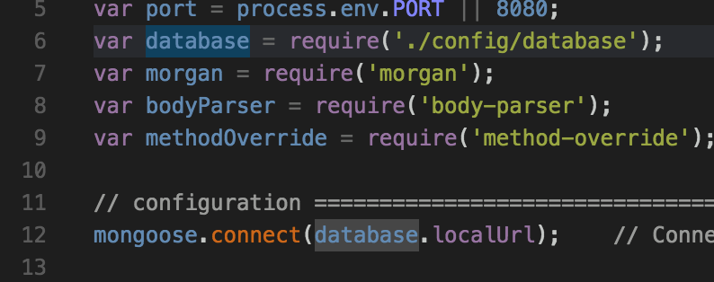 Auto-completion can provide huge productivity enhancements when writing/exploring code, since it prevents you from needing to keep referencing documentation or worrying about API typos. For example, let's augment the hardcoded MongoDB connection string with an environment variable by changing line 12 from this:
